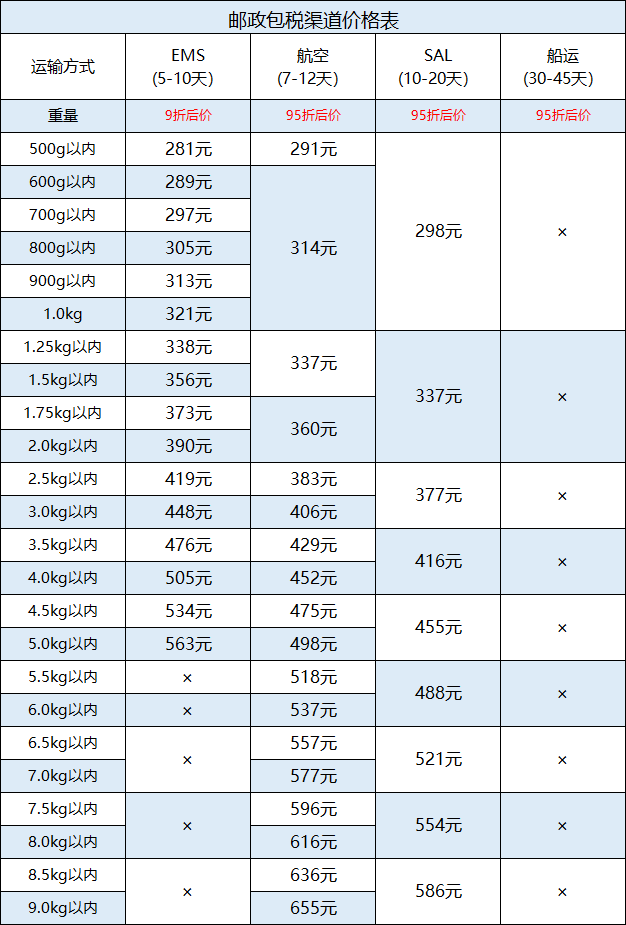 国际段运费(航空/SAL)+清关费180元 (注:东三省加20元,西藏,新疆,青海地区加40元)